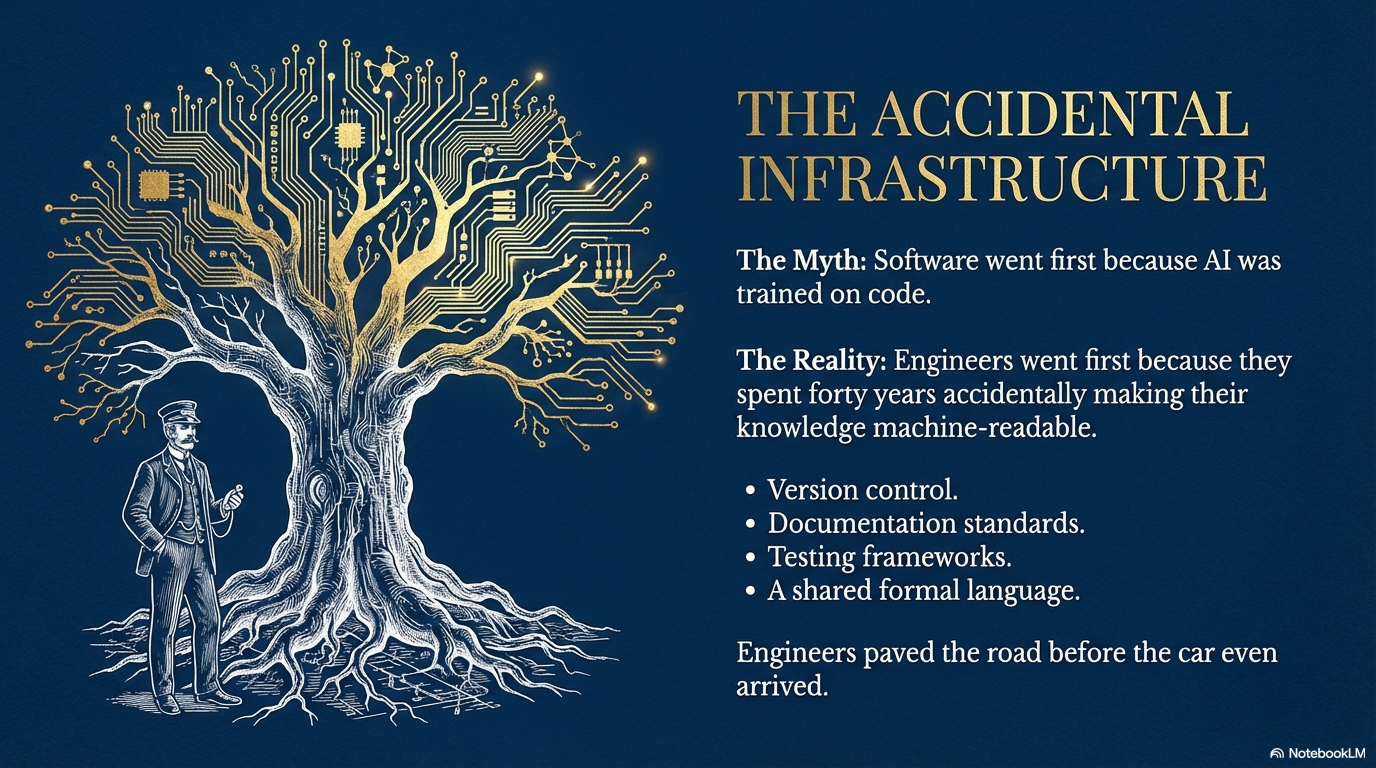 What engineers actually had, and what nobody else has, is forty years of accidentally making their knowledge machine-readable.