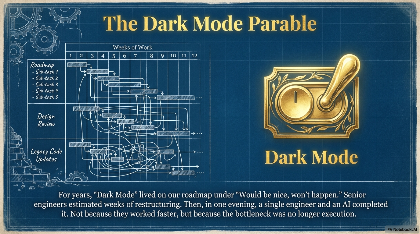 The question is what you build with the time and capability you just freed up. What becomes possible now that wasn't before? What value can you create that didn't exist when humans were spending weeks on dark mode?