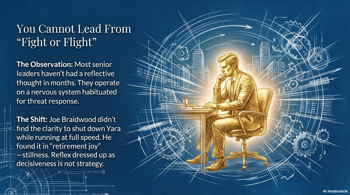 Sadly, many senior leaders I work with haven't had a reflective thought in months. Like the only legitimate mode was output, then domestic logistics, then more output. They're making the most consequential technology decisions of their careers from a nervous system habituated for threat response. That's not strategy and it’s not clarity. That's reflex dressed up as decisiveness. And when you can't access your own values, the incentive architecture is happy to fill the void.