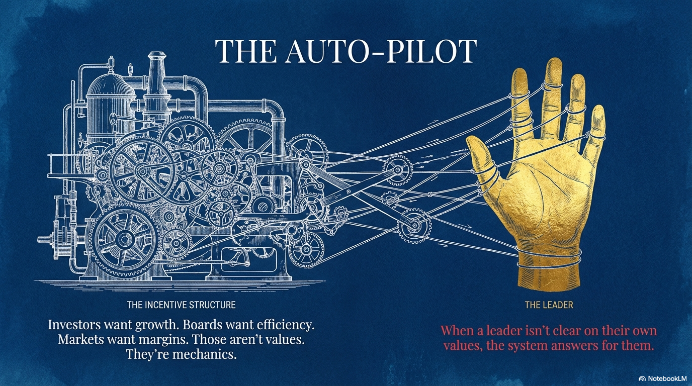 When a leader isn't clear about their own values, the system answers for them. Investors want growth. Boards want efficiency. Markets want margins. Those aren't values. They're mechanics. And AI is the most powerful amplifier of mechanics ever built. Point it at cost reduction without knowing why, and you'll automate away capabilities you need in three years. Point it at productivity without asking "productivity toward what?" and you'll build an organization that moves faster in a direction nobody consciously chose.