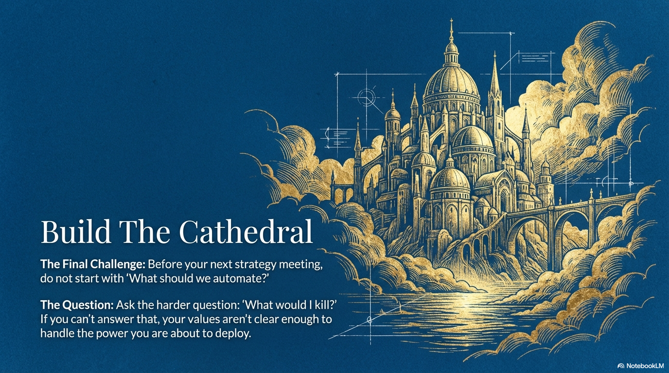 This is the augmentation argument at its deepest level. Automation is what happens when you optimize without values clarity. You cut, squeeze, replace. The dashboard looks clean. And you've built a desert. Augmentation requires knowing what human capability you're trying to multiply. What should your people be able to do in three years that they can't do today? What would make you proud to have built?