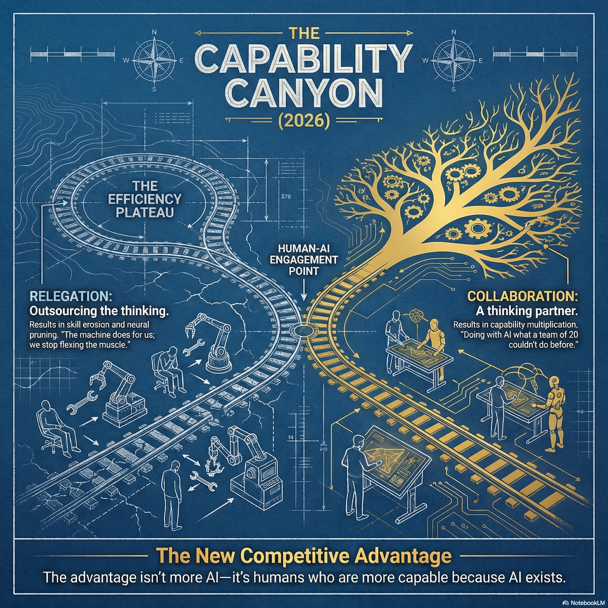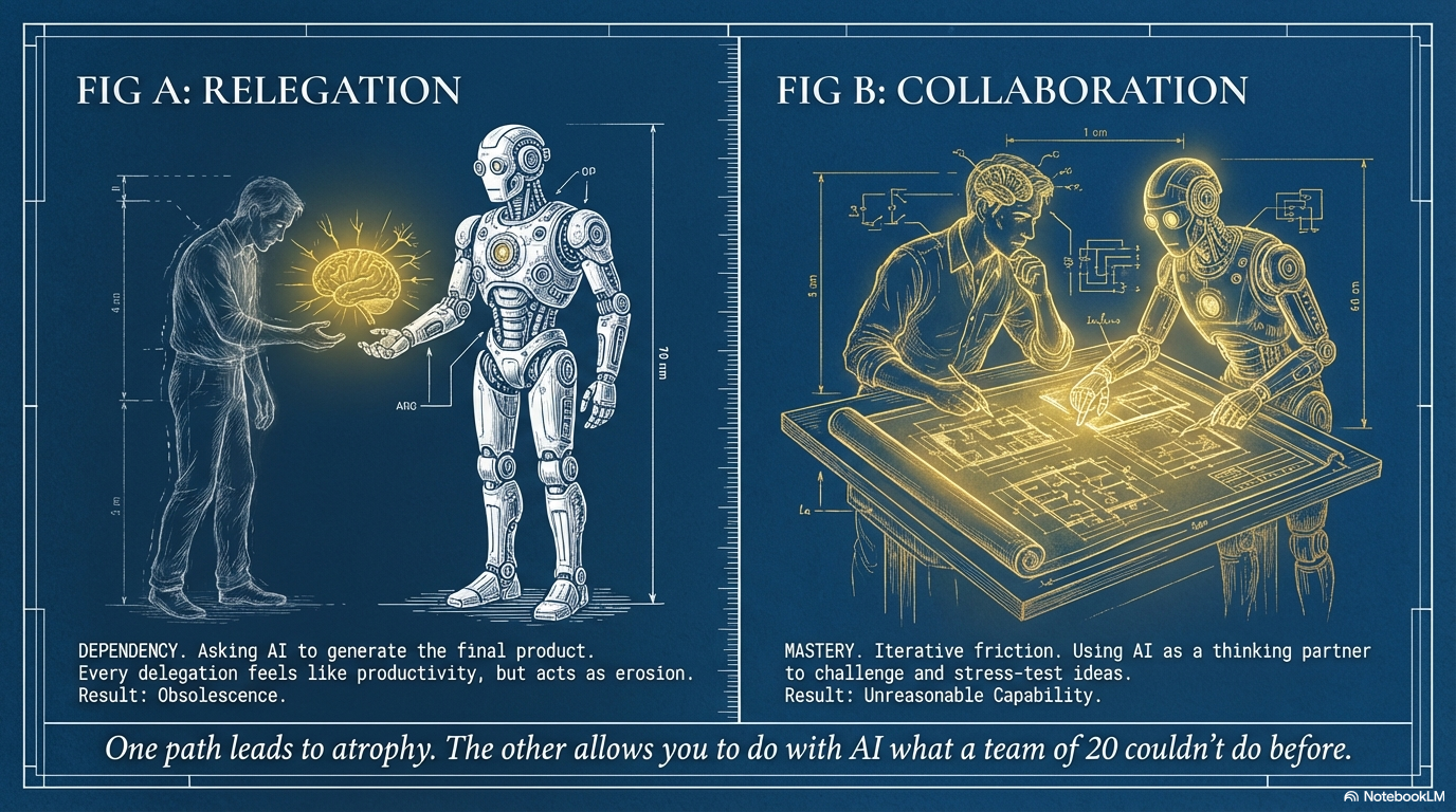 One population asks AI to write the essay. Draft the email. Generate the analysis. They're not building skills. They're outsourcing thinking. Every delegation feels like productivity. It's actually erosion.