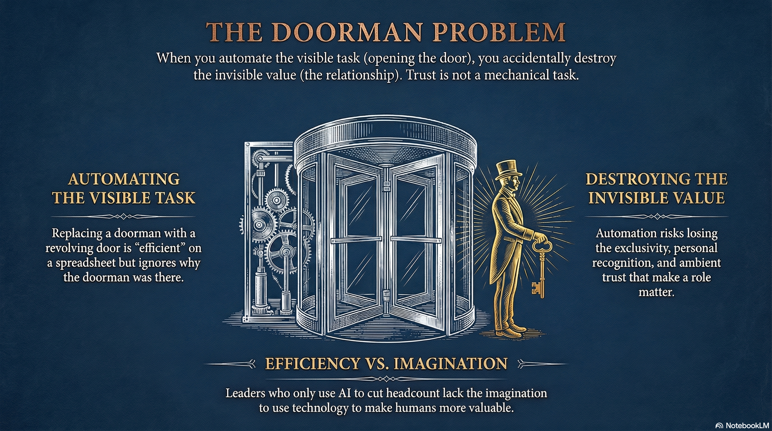 Then we moved on to Rory Sutherland's doorman example, and I think it's the cleanest diagnostic for what's going wrong. When cost-cutting consultants look at a hotel doorman, they see someone who opens doors. So they install a revolving door and pocket the savings. Efficient. Measurable. Defensible on a spreadsheet.
