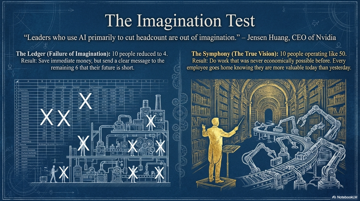 Jensen Huang said something at GTC a few weeks ago that I think is the most important sentence any CEO has uttered about AI this year. The man who sells the chips told the people buying them that leaders who use AI primarily to cut headcount are, in his words, "out of imagination."