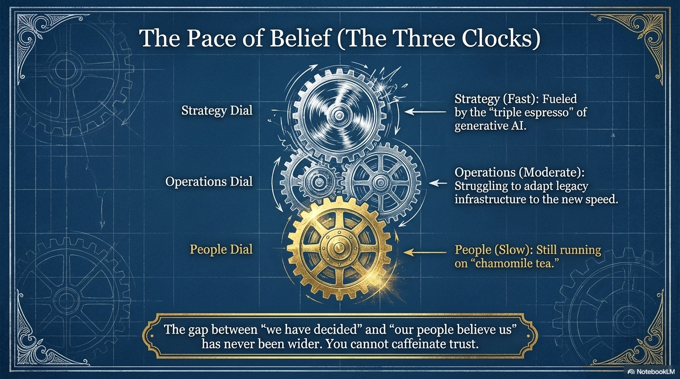 The problem is not that organizations don't understand this. Most leaders, if you cornered them at a dinner party, would nod along. The problem is that AI has given the strategy clock a triple espresso while the people clock is still on chamomile tea. The gap between "we've decided" and "people believe us" has never been wider.