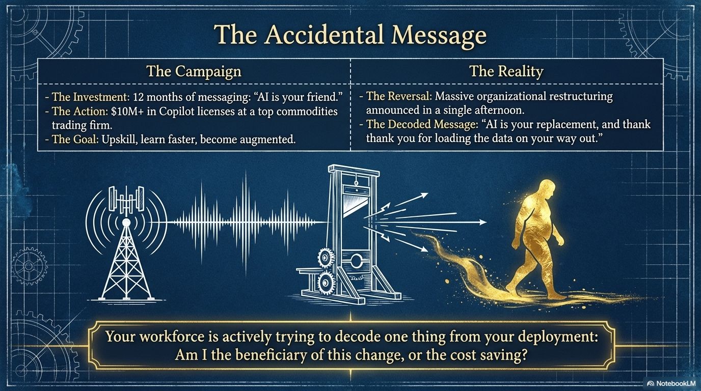 It is happening in your building right now, whether you've approved the messaging or not. Every tool you deploy, every role you restructure, every all-hands where you say "AI will make us stronger" is being decoded by a thousand people trying to figure out one thing: am I the beneficiary of this change, or the cost saving?