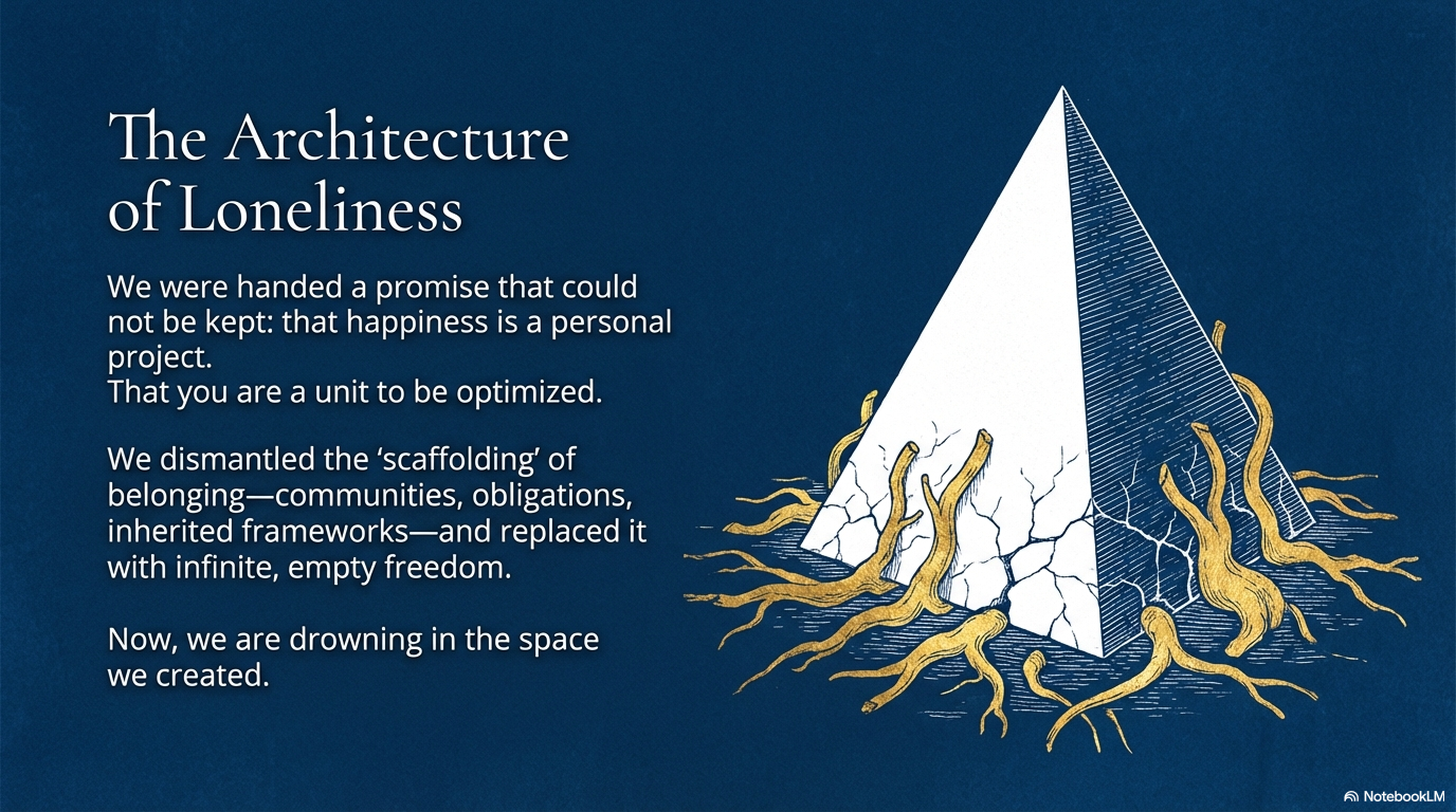 Sometime in the last fifty years, we collectively decided that happiness is a personal project. That meaning lives inside the individual. Find yourself. Optimize yourself. Express yourself. Arrive at yourself. The entire apparatus of modern life bends toward one message: you are the unit that needs to be perfected.